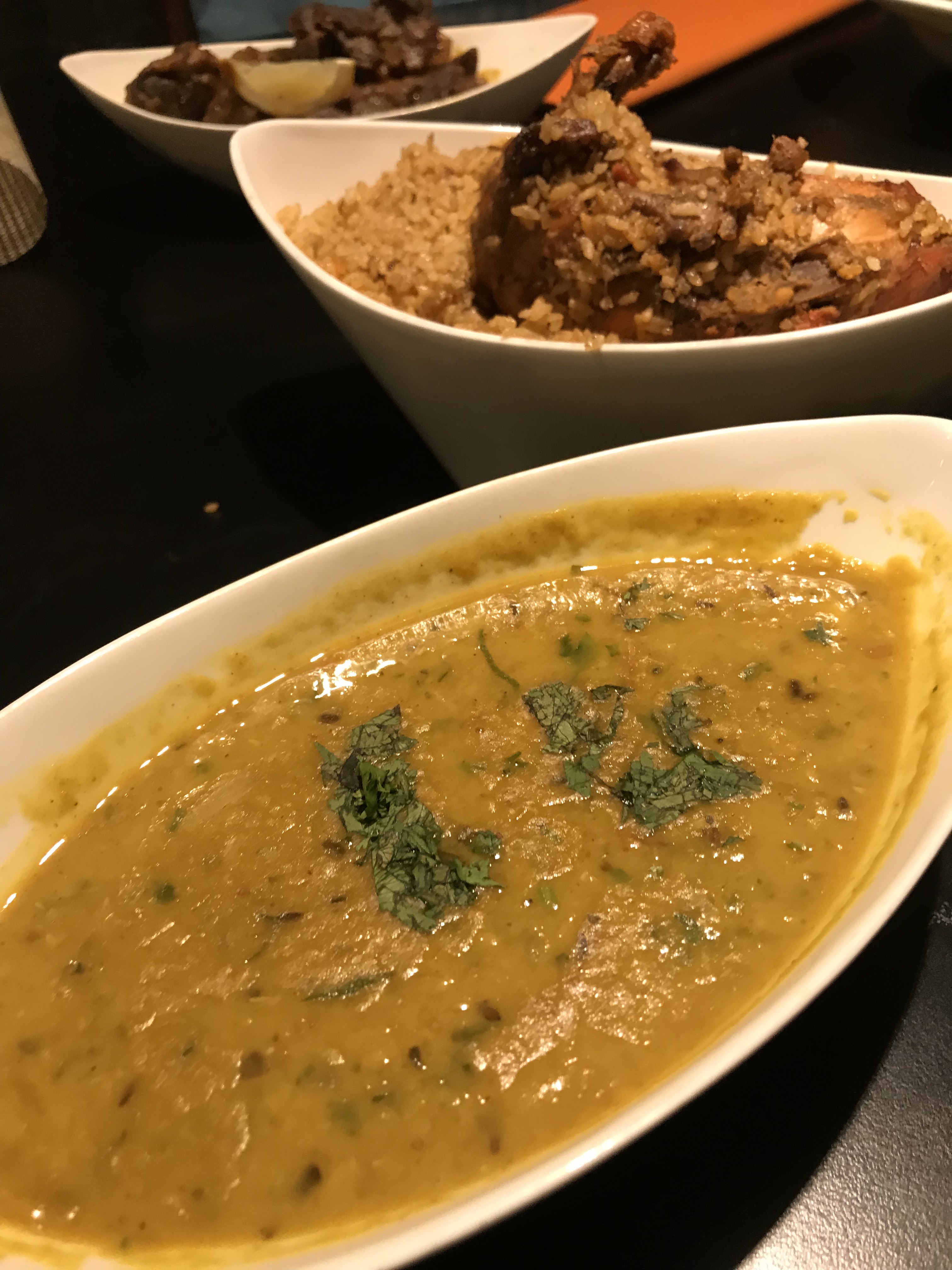 Bahari Bangladeshi Pachmishali Daal where 5 types of pulses (dried beans, lentils) – Moong daal ( yellow lentil), Masoor daal (red lentils), Arhar/ toor daal (pigeon peas), chaana (chick pea ), mattar dal (yellow pea) are dry roasted in a pan that pulls the actual flavour of the daals and then cooked into a thick spicy stew eaten with rice. A mainstay of Bangladeshi cuisine.