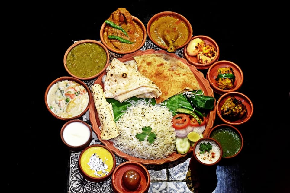 Awadhi Thali – Masala chaanch, Galawti, Gondhoraj murgh tukde,Fish paturi tikka, Roomali roti, Lucknowi paratha,Keema biryani, Dal Paalak, Shahi mixed veg, chicken dumpukht, Mutton bund gosth, Papad, Chutney, Salad, Gulab jaamun, Firni, Mishti doi, Paan.