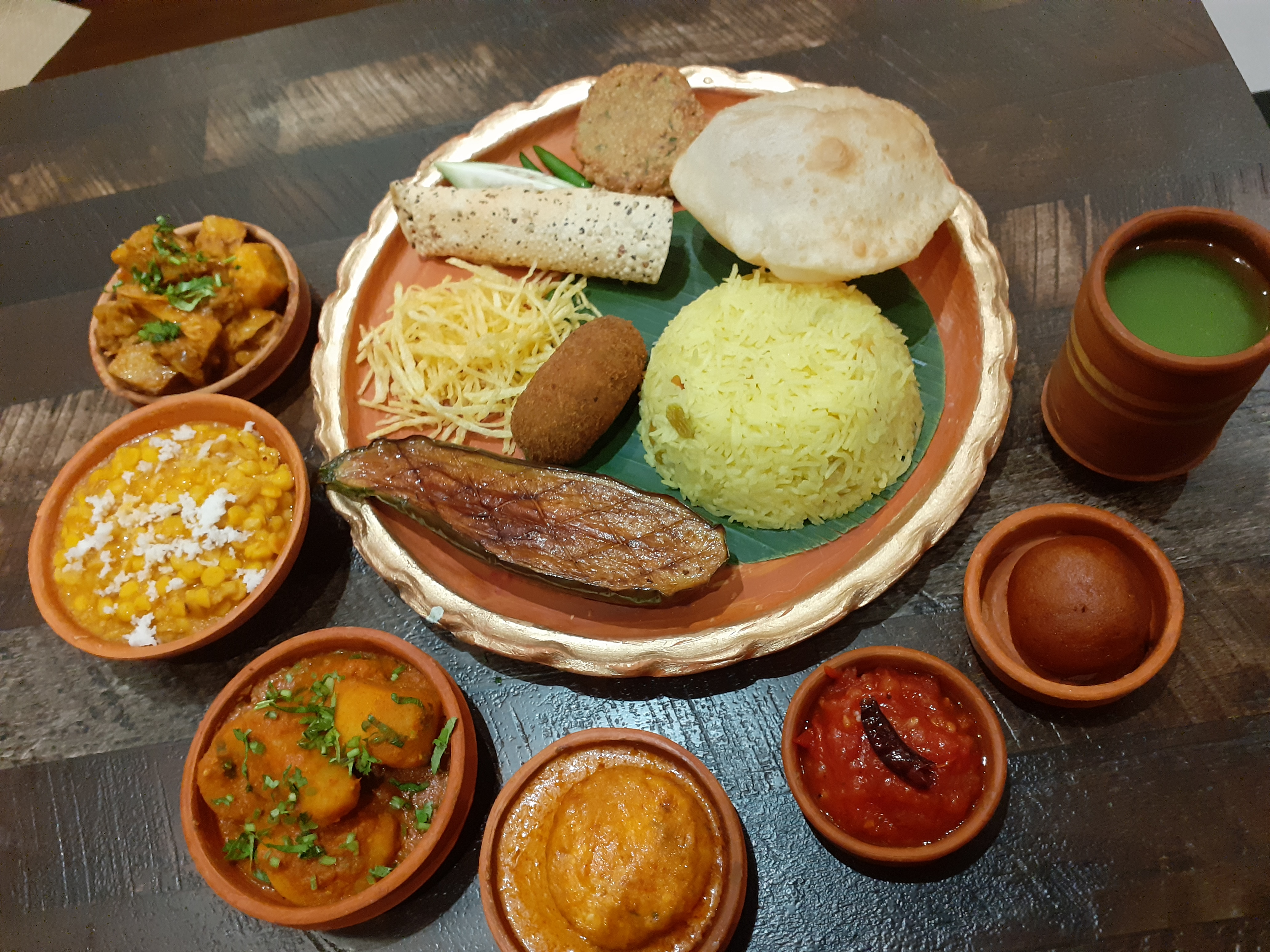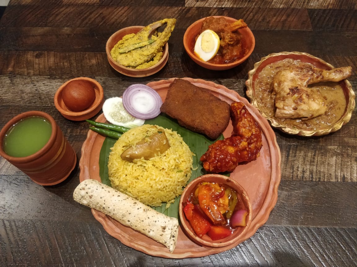 Bengali Flavour Infused Thali – Masala chaanch, Tandoori egg tikka, Gondhoraj murgh tukde, Fish paturi tikka, Roomali roti, Lucknowi paratha, jeera rice, Dal Paalak, Shahi mixed veg, chicken dumpukht, fish Maharani, Papad, Chutney, Salad, Gulab jaamun, Firni, Mishti doi, Paan.