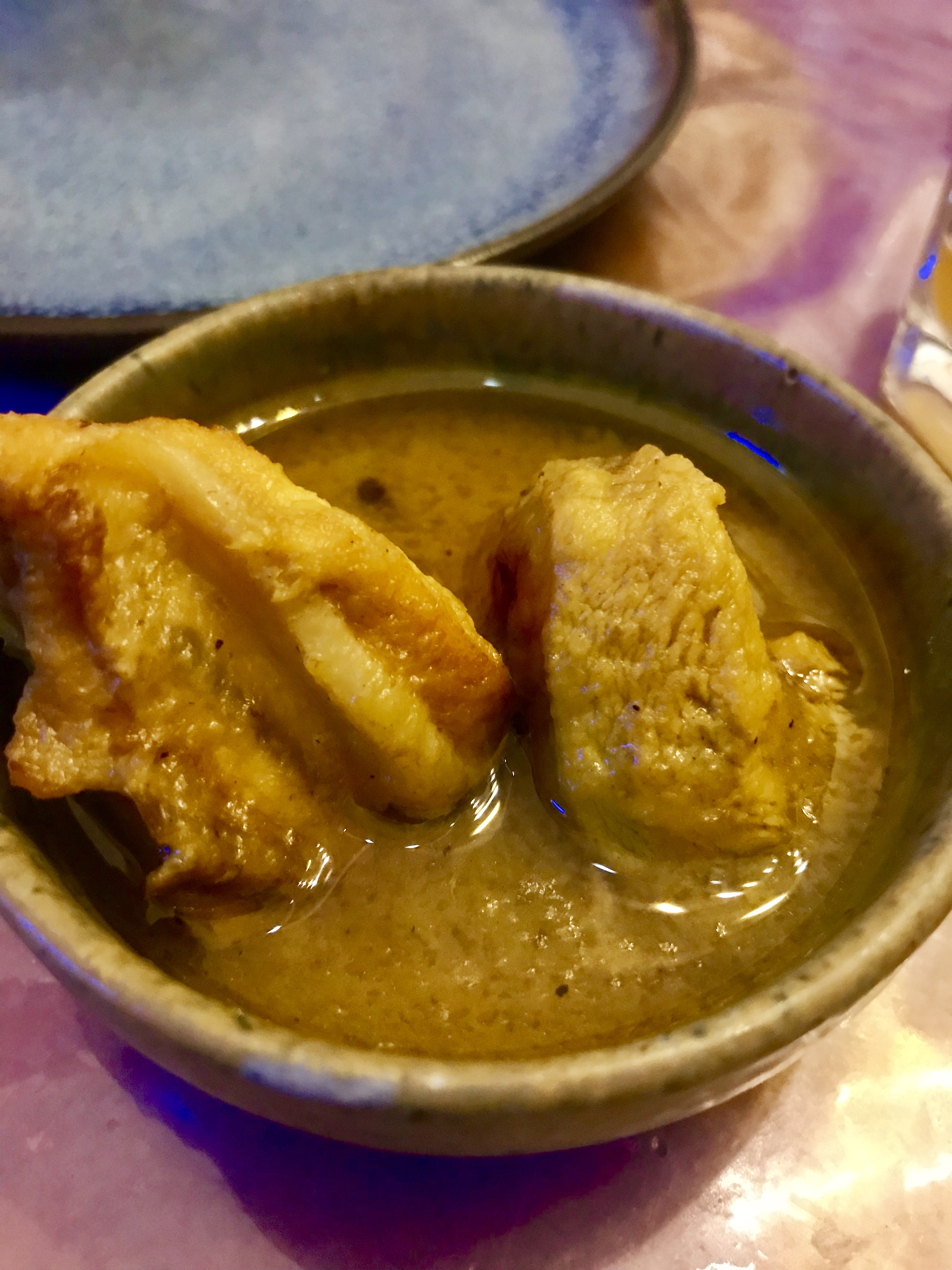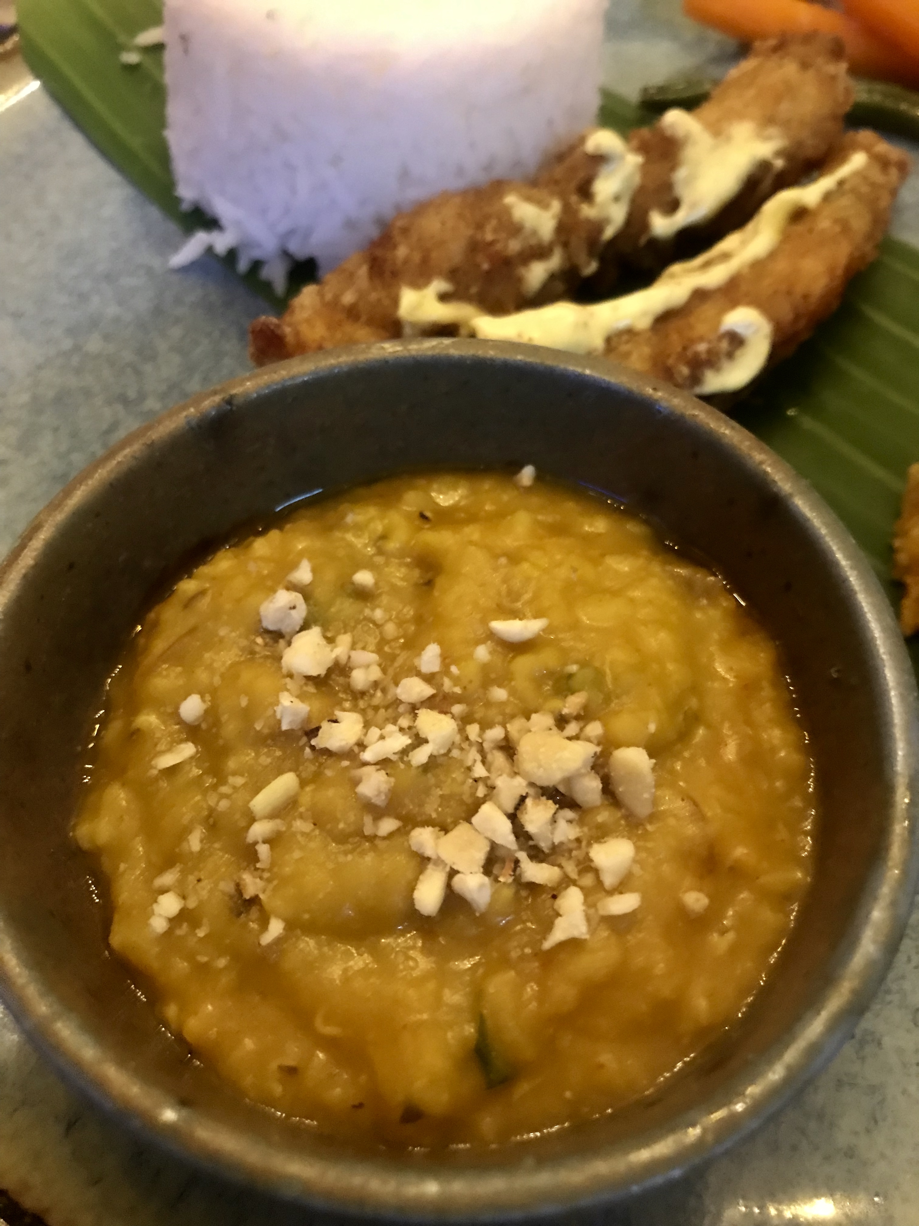 The scrumptious seafood delicacy. A medium piece of prawn crumbled in breadcrumbs and deep fried till golden brown laid gorgeously with few spoons of red curry leaving its tail peeping out from the mini bowl. The best part of the dish is that the crispiness of the croquette remained intact in spite of the curry.