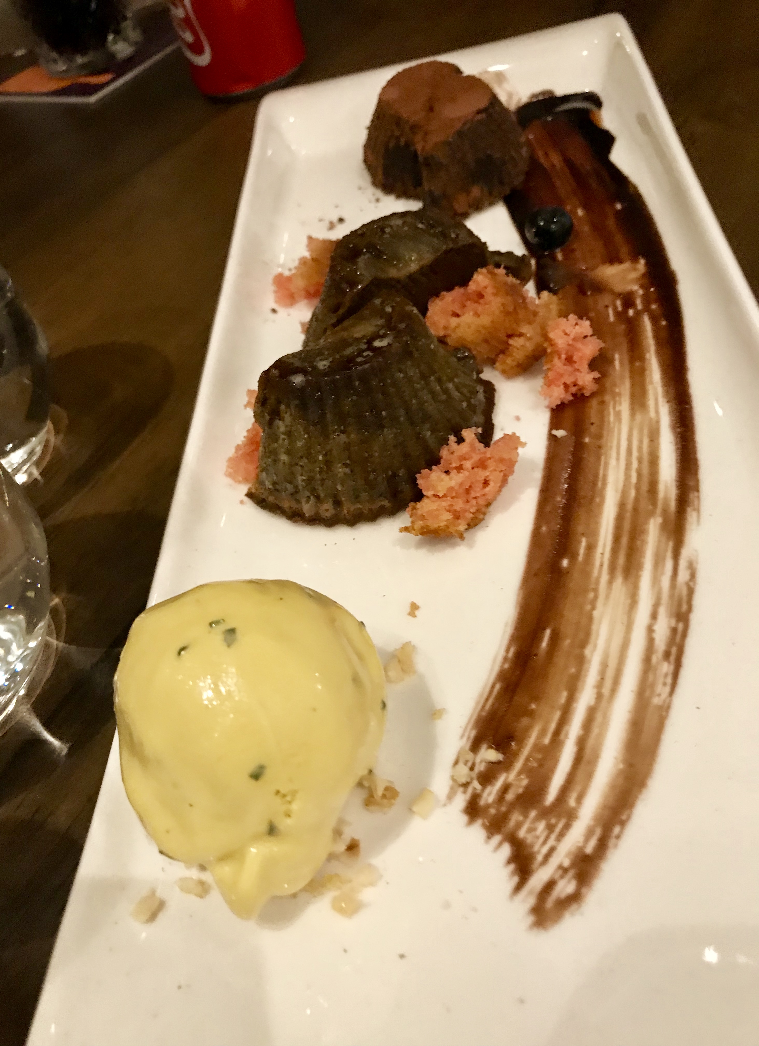 A fudgy sweet cardamom infused fudge served with a dollop of ice cream.