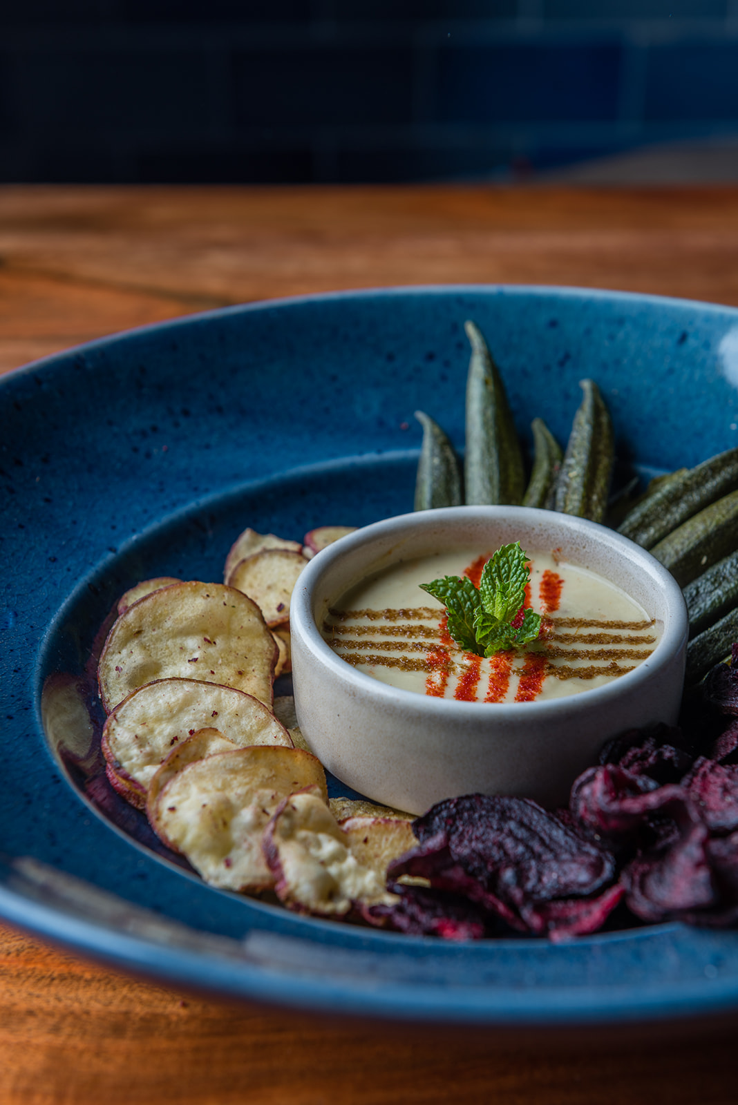 Veggie Crisps with Moongdal Hummus (crispy bhindi, sweet potato and beetroot with a moongdal hummus dip).