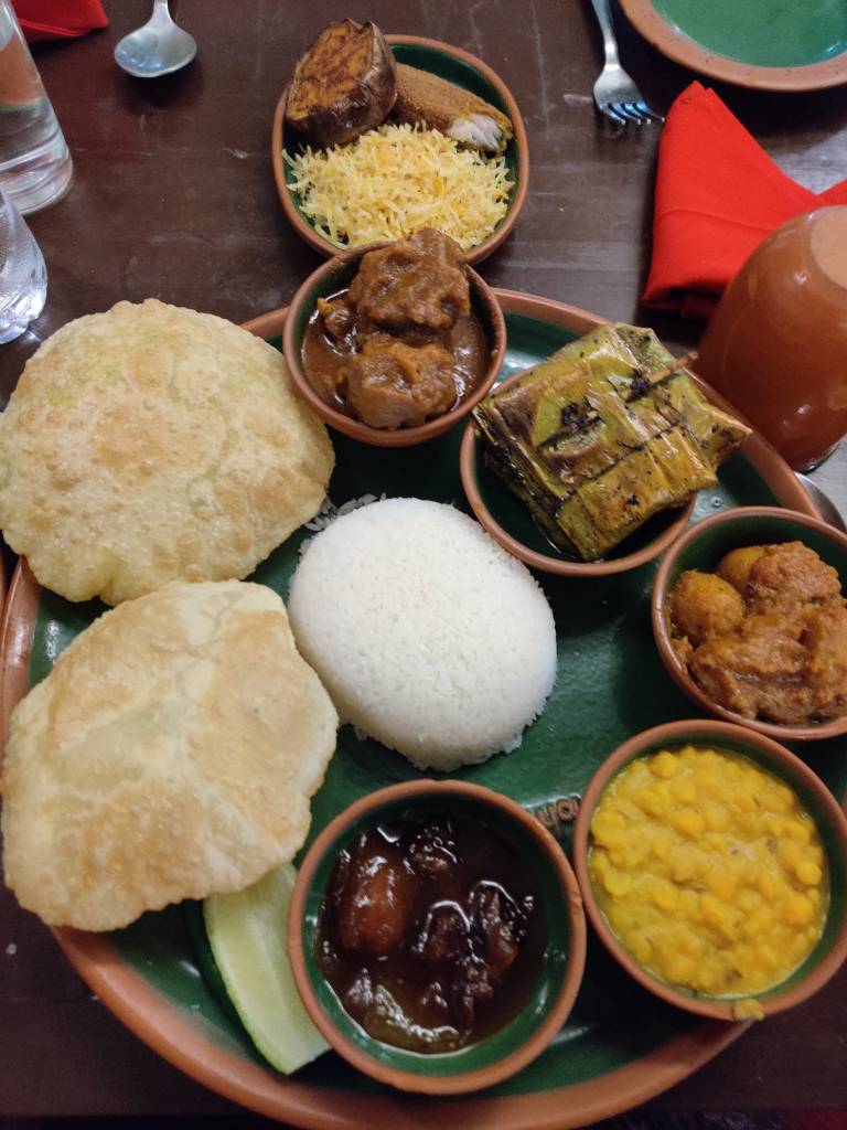 Today, I tried their finger licking signature MINI BENGALI THALI that features – Luchi, Radhaballavi, Cholar Daal, Bhaja Masala Aloor Dum, Steamed Rice, Jhuri Aloo Bhaja, Begun Bhaja, Bhetki Paturi, Kasha Mangsho, Khejur Chutney, Nolen Gur Rajbhog, Misti Doi.