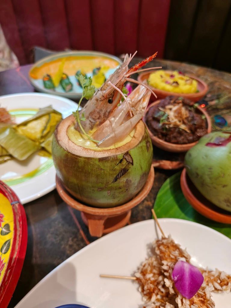 Brace for a delectable journey with Bhetki Paturi, Daab Chingri, Kosha Mangsho, Poha Crusted Chicken Skewers, Pokchoy wrapped Gondhoraj Steamed Chicken, Rasmalai Cream Brûlée, Summer 69 (cocktail).