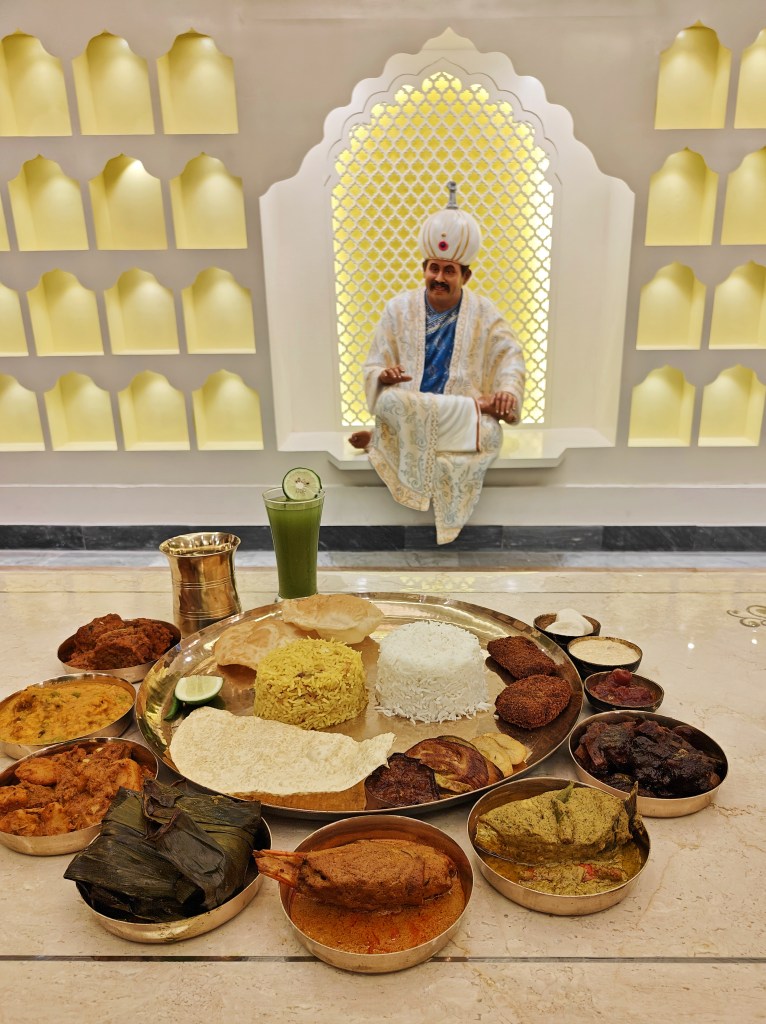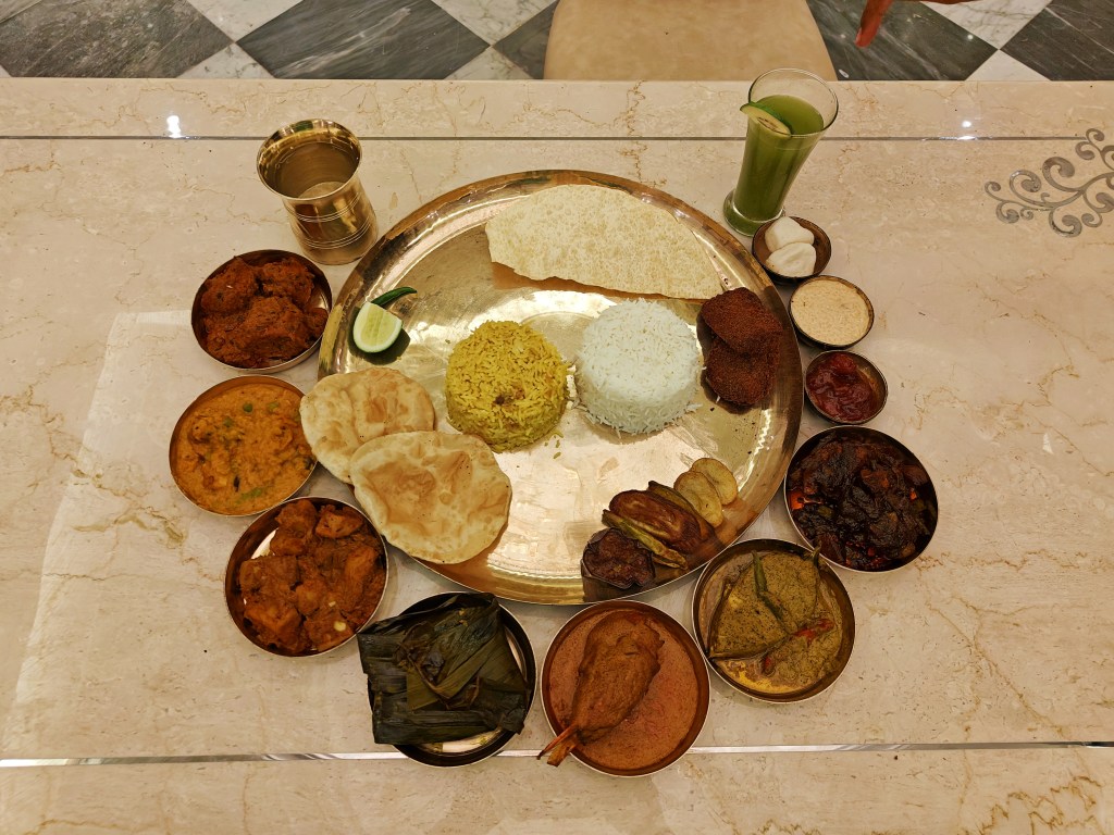 Bhaat, Misti Polao, 5 types of Bhajas, Alur Dom, Dhokar Dalna, Luchi, Dal, Jhuri Aloo Bhaja, Fish Fry, Bhetki Gondhoraj Paturi, Shorshe Ilish, Chingri Malaikari, Bhooter Kasha Mangsho, Papad, Chutney, Payesh, Rosogolla, Aampanna Sarbat.